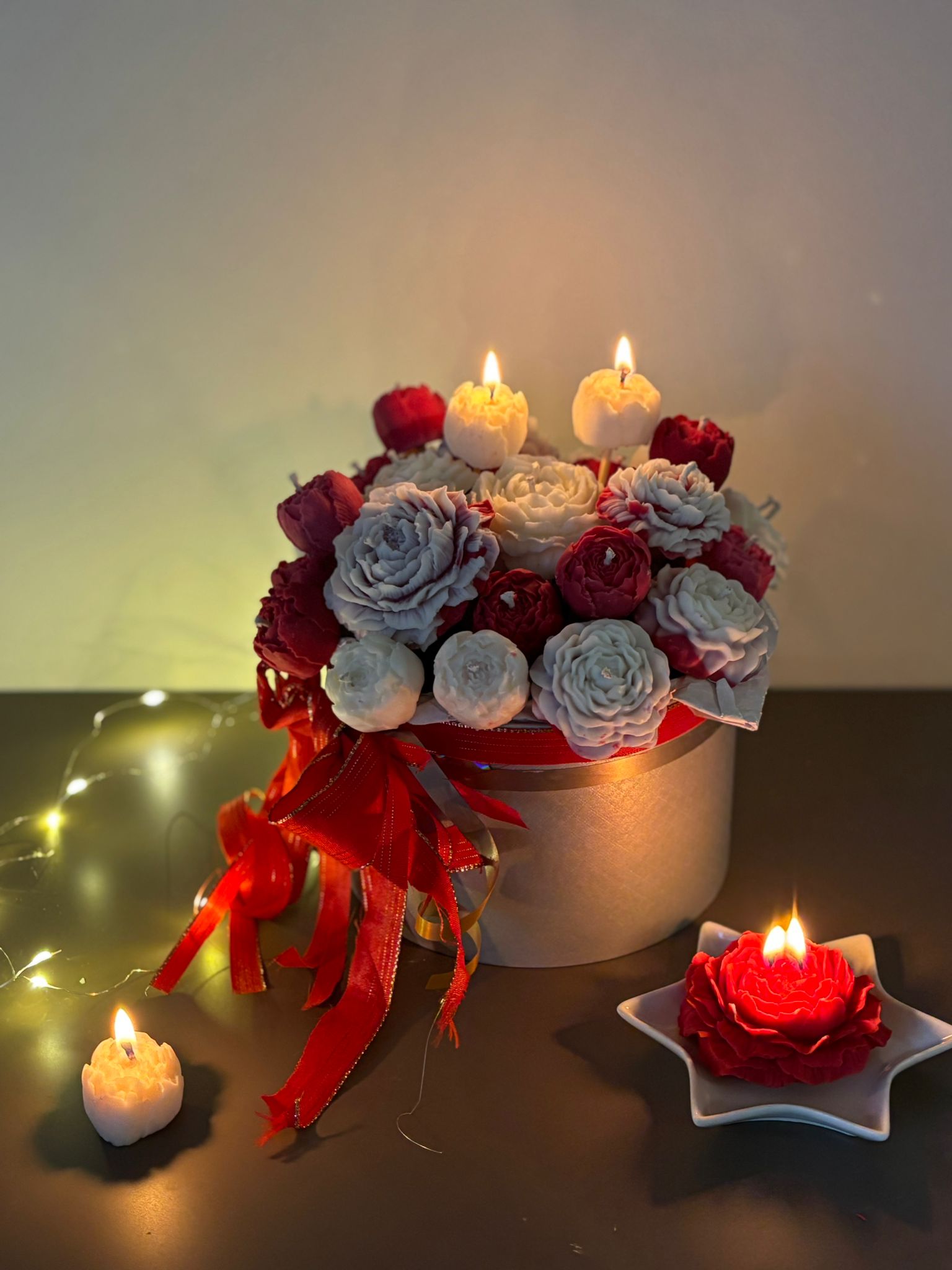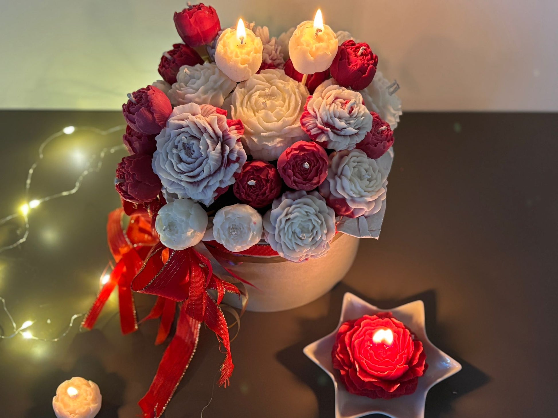 Un raffinato bouquet floreale di candele artigianali: tanti fiori in cera di soia naturale (peso complessivo circa 700g), profumati con la fresca ed elegante essenza di fresia.