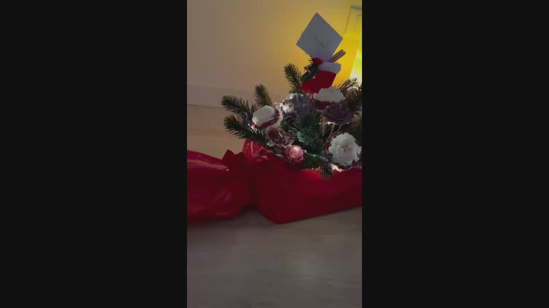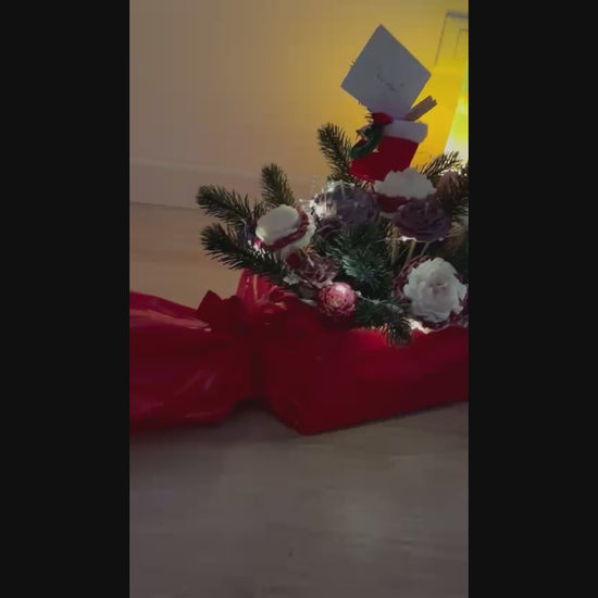 Una creazione natalizia unica e artigianale: una scatola rossa a forma di cioccolatino, con dettagli bianchi, lucine decorative, la ciabatta di Babbo Natale 🎅 e petali di pino che richiamano la magia delle feste.